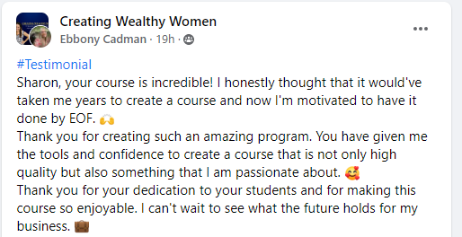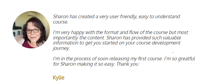 ''In 3 months of working with Sharon I now have a business that is out of my head and coming to life. I have saved both time and money by not having to figure it all out by myself and making costly mistakes! If it wasn’t for Sharon, I’d still be at home dreaming about starting a business''